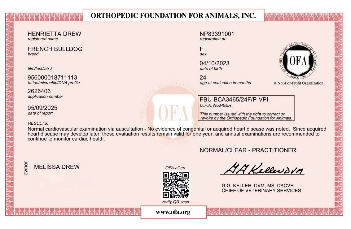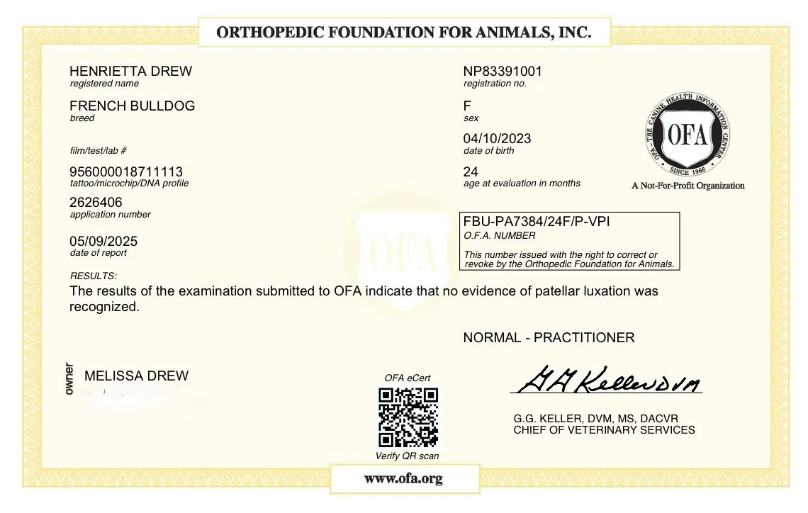 Henrietta is a super fun-loving, frenchie mama! She absolutely loves the littlest Drew...which is good because Adelay has claimed her as her own.