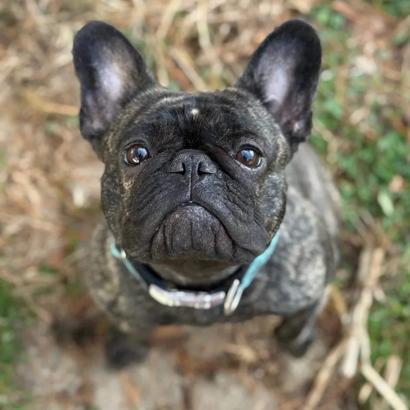 Her structure is perfectly balanced. We are so thrilled to have a black brindle back in the pack! But, favorite physical feature has to be the brindle dot in the middle of her forehead! Its just so cute!